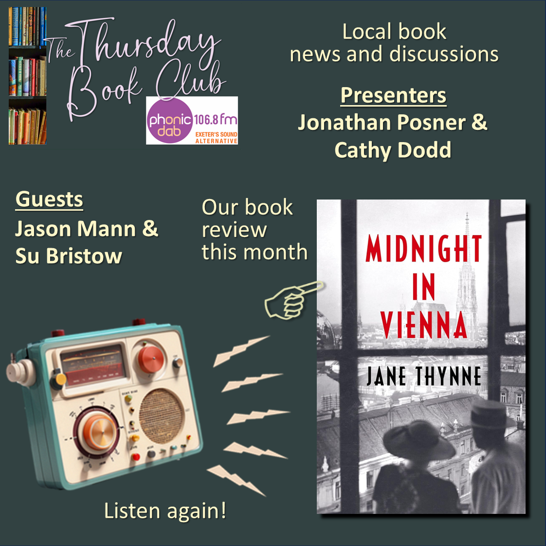 The latest edition of The Thursday Book Club was broadcast on 15th January 2026 at 2pm on Phonic FM. Joining hosts Jonathan Posner and Cathy Dodd were Jason Mann and Su Bristow. Click the names to find out more about them, and use the audio bar below to listen to the full show.