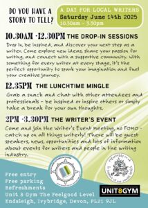 As part of the South Hams Literary Festival, there’s a Writers’ Day on Saturday 14th June, from 10:30 to 3:30 at the Unit 8 Gym in Ivybridge. Ther’s a drop-in session for writers to get advice, help and inspiration from other writers. There’ll also be guest speakers, a networking lunch, and lots more! Free entry. Free parking. Refreshments available. All welcome. Whatever level of writing you’re at, there will be something of interest to you. Just drop in. No need to book.