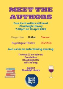 Chudleigh Writers are holding a Meet the Authors event on 23rd April at 7pm for World Book Night. Four authors will be talking about their work across a number of popular genres. Tickets are £3 from three shops in Chudleigh; Dandelion, Chudleigh DIY and Off the Peg. The authors are: Elizabth Ducie, Madeline Dyer, Sarah Boner and Sharon Cook.