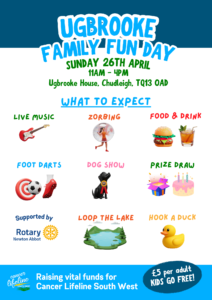 On Sunday 26th April Cancer Lifeline South West will be holding a Family Fun Day in the grounds of Ugbrooke House. It’s going to be a packed day with a dog show; live music; craft fair; zorbing and other games; food court and licensed bar; and a prize draw with some BIG prizes. Plus, this year, they are introducing a sponsored walk around the beautiful grounds of Ugbrooke House. Tickets via www.cancer-lifeline.org.